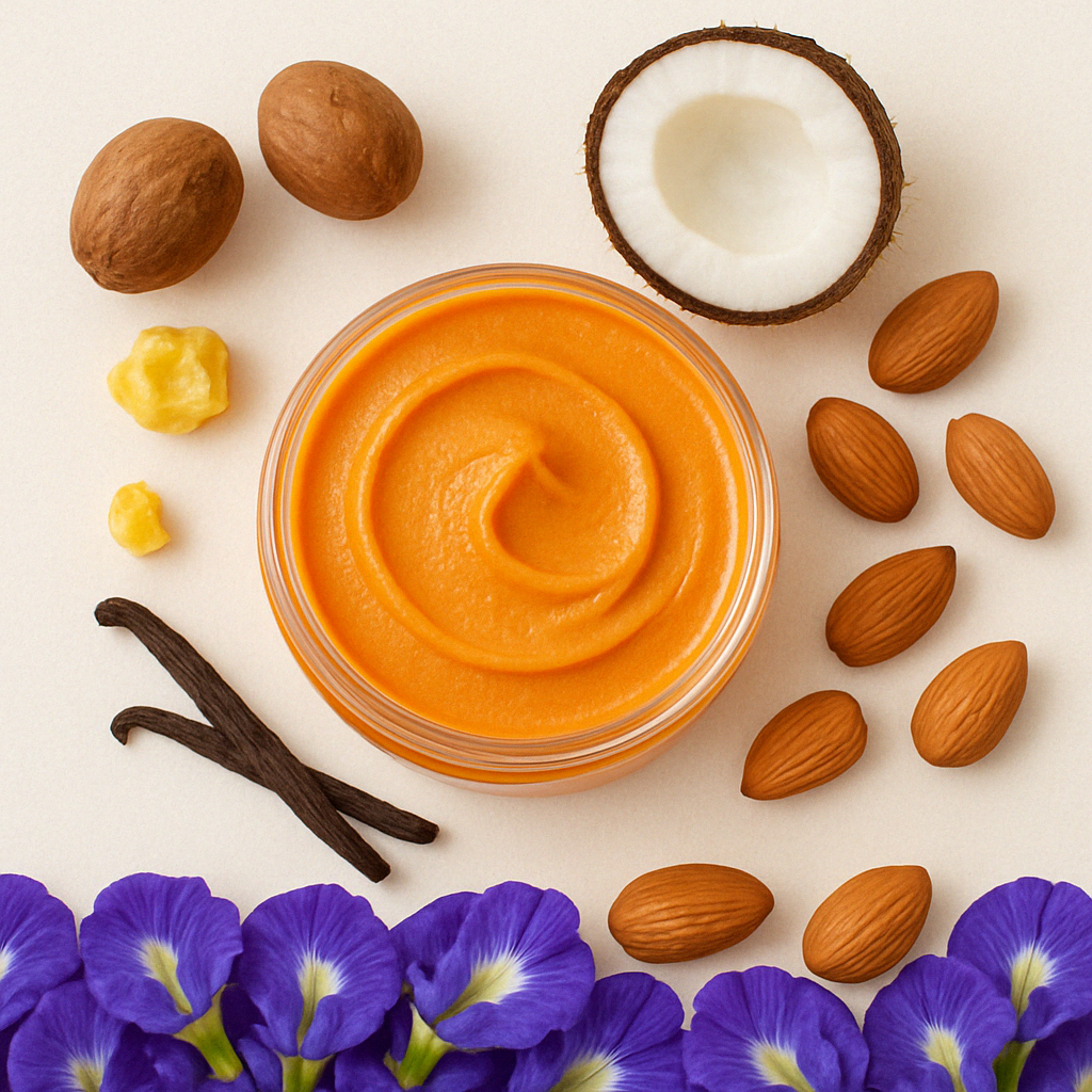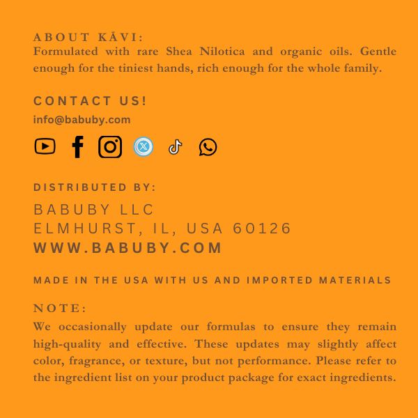 Crafted with organic Shea butter and a curated blend of organic oils, this luxurious formula is gentle enough for the tiniest hands and rich enough to hydrate the whole family. Its vibrant orange hue and velvety, silky texture are naturally derived from our unique, non-greasy formulation—our little secret to radiant, healthy skin.