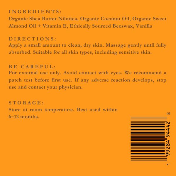 INGREDIENTS: Organic Shea Butter, Organic Coconut Oil, Organic Sweet Almond Oil + Vitamin E, Ethically Sourced Beeswax, Vanilla